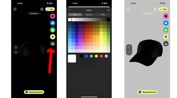 Click to open the 3D mockup workspace. Next, click the background icon (indicated by the red arrow), set the background color, and then click the X. Now that the background has been changed, you are ready to use all the features of the CBOs app