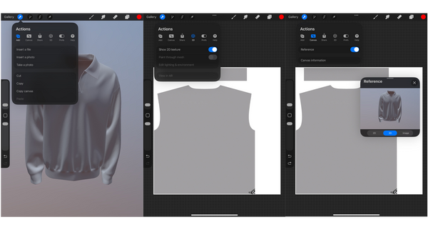 Start texturing and coloring by enabling Show 2D texture. Tap the Wrench icon (Actions), select 3D, and turn on Show 2D texture. Next, go to Canvas and switch on Reference to view the changes in real-time!